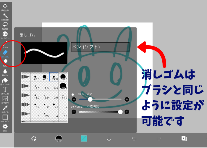 「ブラシ」の設定と、「消しゴム」の設定は別々で記憶します。