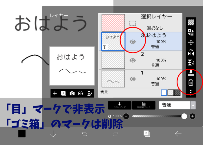 レイヤーの操作画面から、下書きのレイヤーを非表示にしましょう。「5.ペンの色を変えて下書きを描こう」の「レイヤーの非表示と、削除の方法は?」に書いた通り、「目」のマークをタッチすれば非表示になります。